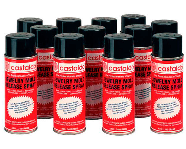 CASTALDO Kauçuk Kalıp Ayırıcı Spreyi (kırımız renkli ambalaj) saf silikon yağından mamul olup aerosol sprey kutularında ve kauçuk ya da metal kalpların üzerindeki mum artıklarını çıkarmakta kullanılmaktadır. CASTALDO Kauçuk Kalıp Ayırıcı Spreyi renksiz, kokusuz, içinde toksik madde bulunmayan yağ içermeyen, dayanıklı ve kullanımı güvenli bir üründür. Bu ürünün içinde CFC (Florokarbon gazları), ve VOC (Uçucu Organik Kimyalar) bulunmayıp kullanımı aşamasında CASTALDO “White Label”, “Gold Label” ve “No Shrink Pink” kuyumcu kalıp kauçukları gibi doğal kauçuktan yapılmış kalıplara zarar vermeyecek şekilde formüle edilmiştir. Kalıp ayırmakta kullanılan diğer spreylerin aksine bu ürün kesinlikle patlayıcı ya da yanıcı madde ihtiva etmemektedir.